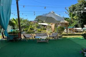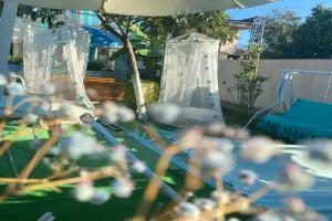 Здание гостевого дома в 2 этажа, на каждом этаже по 4 номера. Во дворе гостевого дома много разных зон для отдыха, где гости могут уединиться и отдохнуть на свежем воздухе. Есть мангальная зона, кальянная зона(с бесплатным кальяном), зона с шезлонгами и гамаками, мягкая зона с подушками, бунгало, шатер, теннисный стол, батут(3м. ) детская площадка.