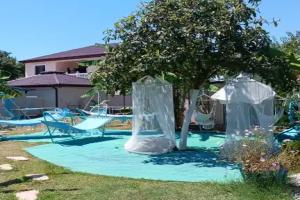Здание гостевого дома в 2 этажа, на каждом этаже по 4 номера. Во дворе гостевого дома много разных зон для отдыха, где гости могут уединиться и отдохнуть на свежем воздухе. Есть мангальная зона, кальянная зона(с бесплатным кальяном), зона с шезлонгами и гамаками, мягкая зона с подушками, бунгало, шатер, теннисный стол, батут(3м. ) детская площадка.
