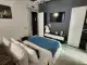 Двуспальная кровать, два больших удобных кресла, журнальный столик.