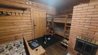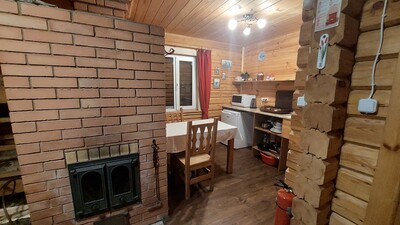 В апартаментах имеется 1 двухспальная кровать, 1 двухъярусная подростковая кровать, кухня, санузел с душем и туалетом. Дом вмещает 2 взрослых и 2 ребёнка. Отопление -печь-камин. На территории имеется детская площадка, баня, летняя кухня (с русской печью), беседка с настольным теннисом, волейбольное кольцо, парковка. В 25 метрах протекает лесная речка Малиновка.