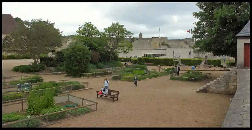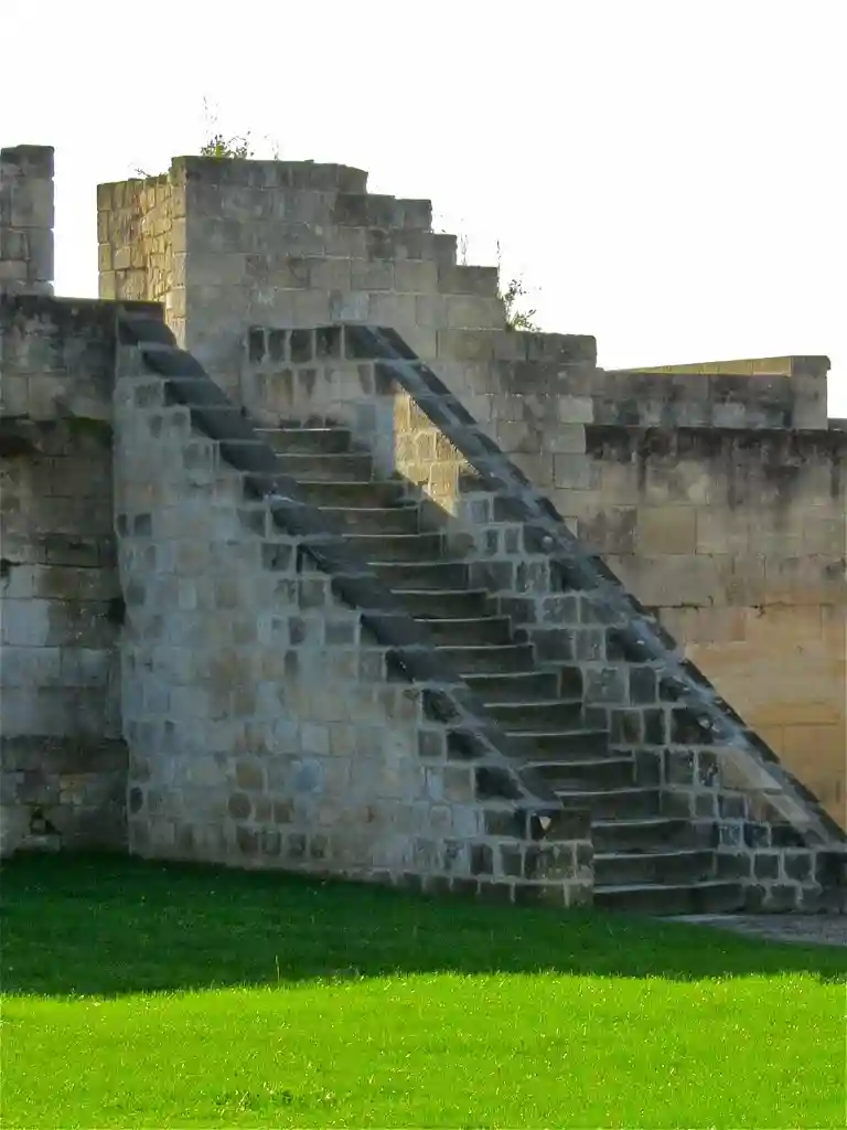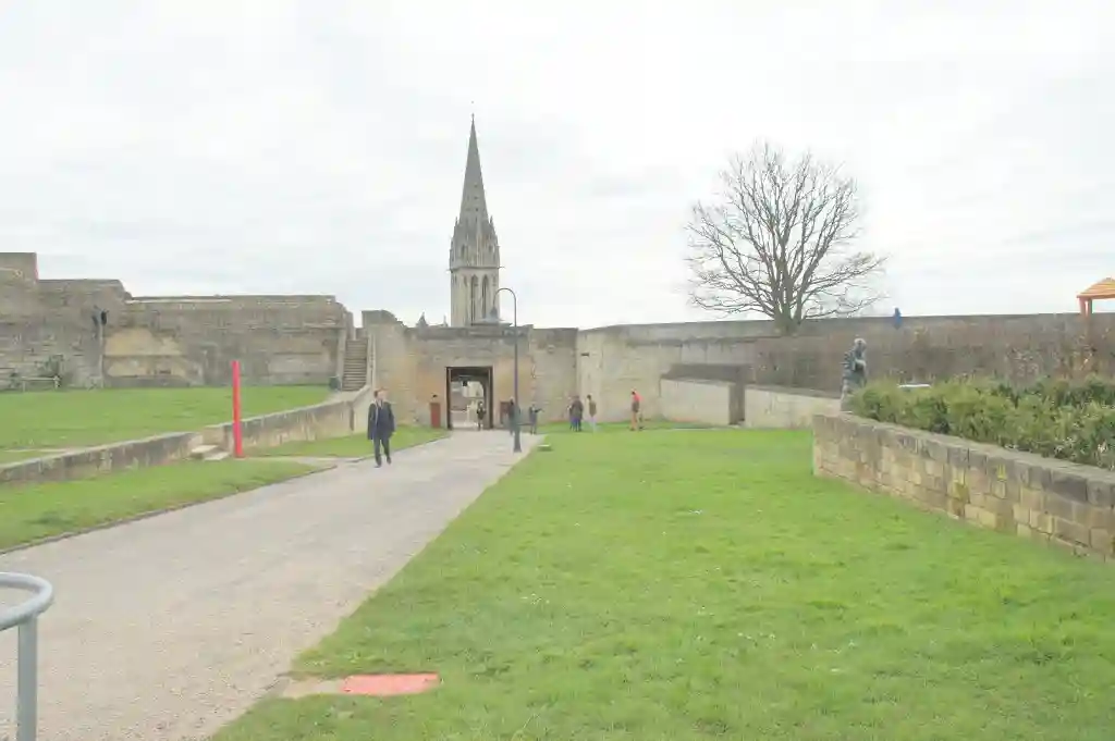 - Стены. Стены крепости в основном воздвигнуты в XV веке, сохранились участки XII века. В крепость ведут двое ворот: ворота Сен-Пьер (Porte Saint-Pierre) на юге и ворота Дешан (Porte des Champs) на северо-востоке. И те и другие ворота укреплены барбаканами. Доступ на стены разрешён, с них открывается живописный вид на Кан.
