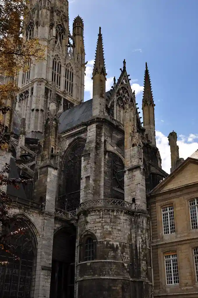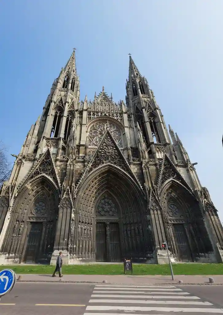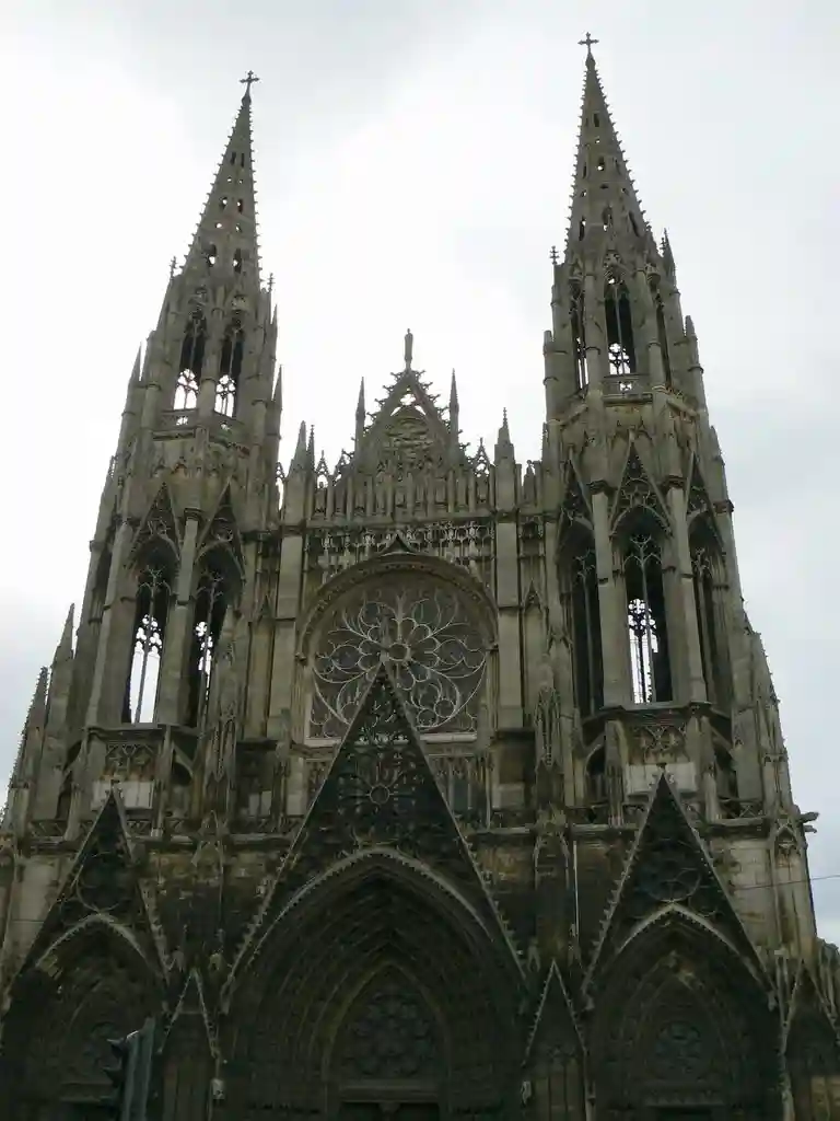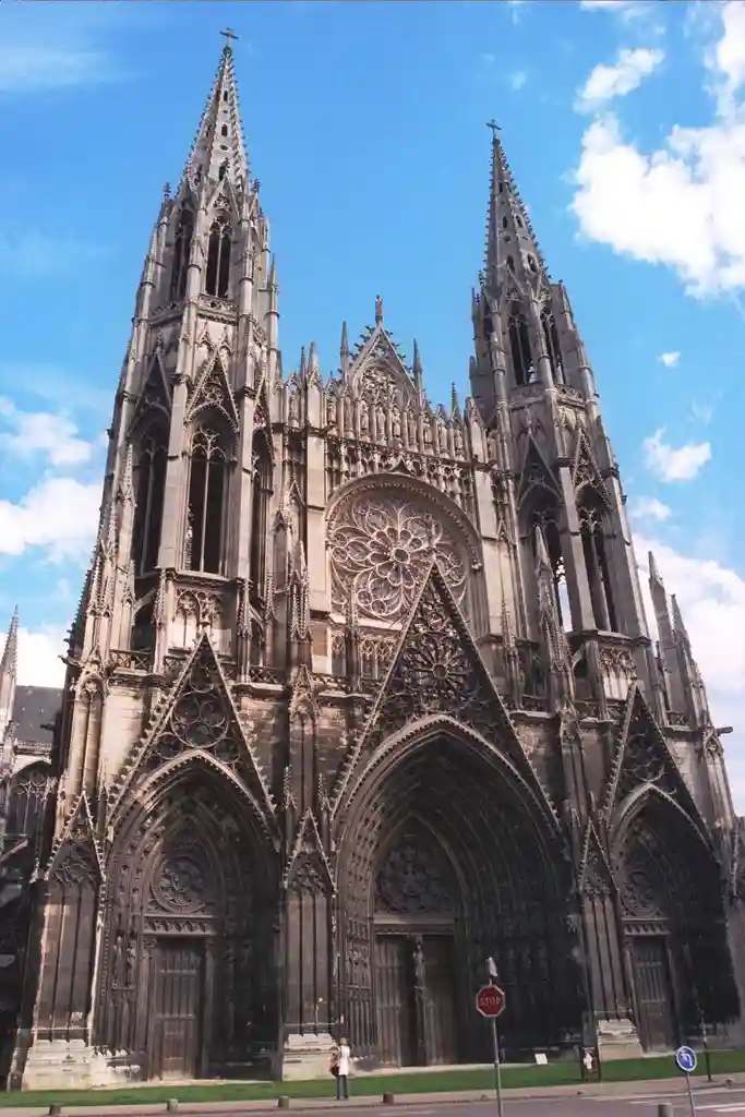 Церковь Сен-Уэн-это больше, чем Руанский собор, и имеет гораздо меньше внешней отделки, поэтому обширные готические пропорции и чистота линий делают непосредственное воздействие на зрителя.