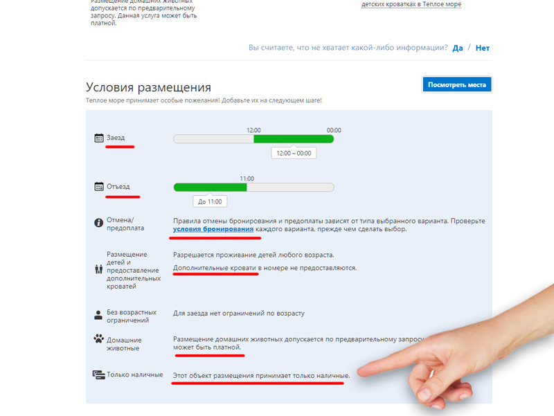 Это очень важный шаг, требующий внимательности. Пожалуйста, внимательно изучите условия бронирования. На странице отеля указаны условия отмены брони и способы оплаты. Укажите всех гостей в поиске, чтобы дополнительные спальные места, в случае необходимости, считались автоматически.