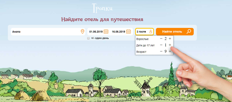 На Главной странице сайта выберите пожалуйста город, даты поездки и кол-во гостей. Если с Вами путешествуют дети, укажите их возраст на момент выезда, это важно для расчета цены со скидкой.