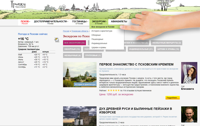 Выбор экскурсии - дело ответственное. Личность Гида, продуманность его программы формирует наше восприятие нового города. Поэтому мы очень разборчивы в выборе партенеров, предоставляющих услуги бронирования. На нашем сайте представлены лучшие авторские экскурсии. Их составляли люди, любящие историю и культуру своего города, своей страны, знающие жизнь изнутри и готовые с радостью об этом поведать. Во всех городах, где нашлись такие увлеченные люди, Вы увидите пункт меню Экскурсии.