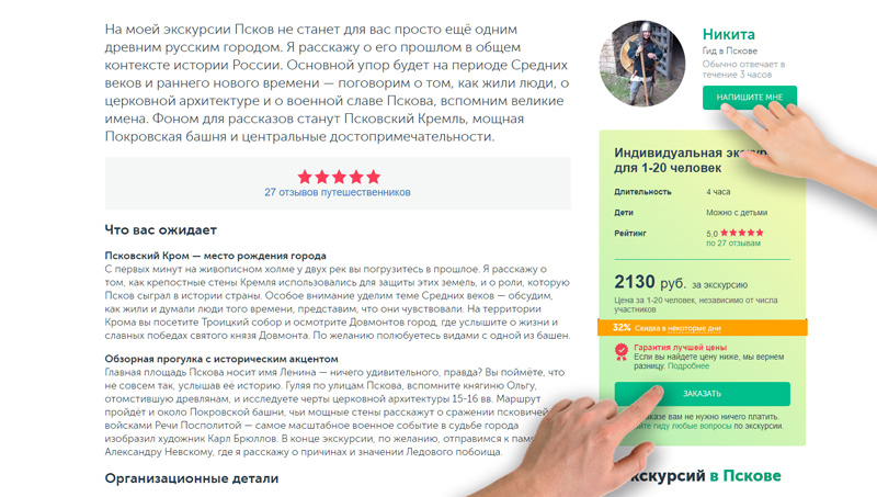 Теперь Вы на странице Гида. Здесь можно прочитать подробное описание маршрута, выбрать удобные даты, задать уточняющие вопросы гиду и забронировать экскурсию.