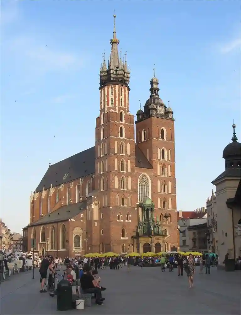 Именно тогда здание приняло современный облик, а последняя масштабная реконструкция была закончена здесь в 2003 году. Спустя 7 лет, в Мариацком костёле состоялась церемония прощания с президентской четой Качиньских, погибших в авиакатастрофе под Смоленском. Главными архитектурными элементами фасадной части храма являются Высокая и Нижняя башня. Первая из них возвышается над площадью на 82 метра и накрыта готическим шлемом авторства Матиаса Херингкана, в 1478 году. Его украшает восьмиугольный шпиль, расположенный в окружении восьми симпатичных башенок. Верхушку шпиля венчает изысканная золочёная корона, диаметром почти 2,5 метра при высоте 1,3. Низкая башня, выполняющая функции костельной колокольни, имеет высоту 69 метров, а накрывает её позднеренессансный шлем, выполненный в 1592 году.
