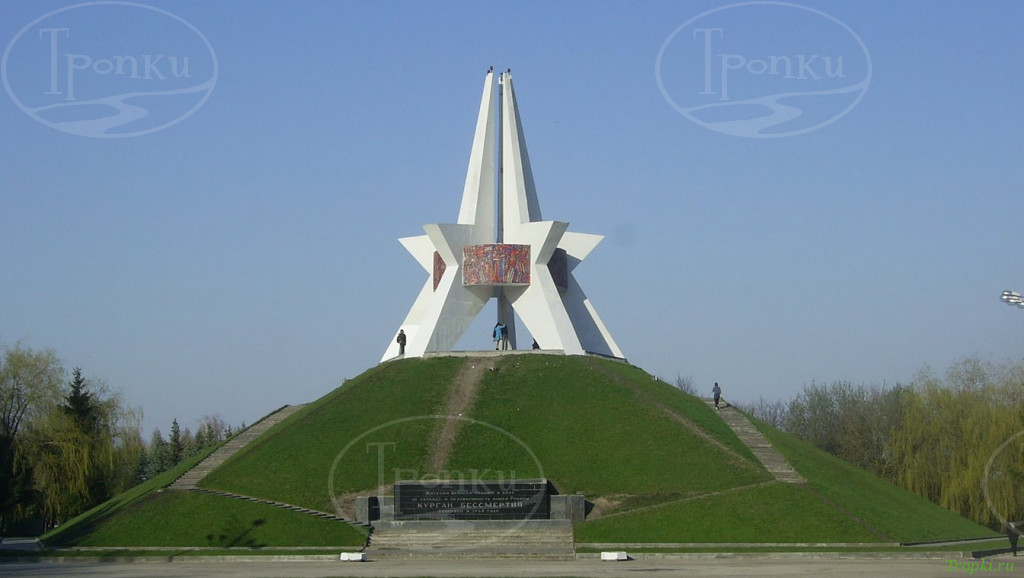Дорогие товарищи, друзья, люди XXI века!.. Никогда не забывайте героического прошлого нашего партизанского края! Всегда помните, какой ценой досталась свобода вашим дедам! Берегите её, как зеницу ока… Мы завещаем вам самое дорогое, что есть у советского человека, — гордость своей Родиной! Любите свою страну так, как любили её мы, ваши старшие товарищи, единомышленники, друзья. Приумножайте могущество Родины Советов! Курган Бессмертия на почтовой марке 1985 г.Основные работы по формированию Кургана проводились в 1967—1968 гг. силами брянских комсомольцев. У основания Кургана ступени широкой лестницы подводят к площадке, на фасаде которой надпись: «Жителям Брянска, павшим в боях за свободу и независимость нашей Родины. КУРГАН БЕССМЕРТИЯ сооружён в 1968 году». Далее две небольшие гранитные лестницы ведут на верхнюю площадку кургана, откуда открывается широкий обзор на левобережье Десны.