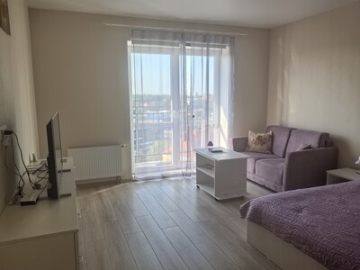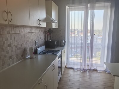 1-ая комнатная квартира, с прекрасным видом из окон, в новом доме. Светлая, просторная кухня, полностью укомплектована. Есть стиральная машина, на лоджии разрешено курение. Wi-fi, кабельное тv, телевизор с интернетом. В квартире есть все для комфортного проживания 3 гостей, 3 спальных места (кровать + диван).