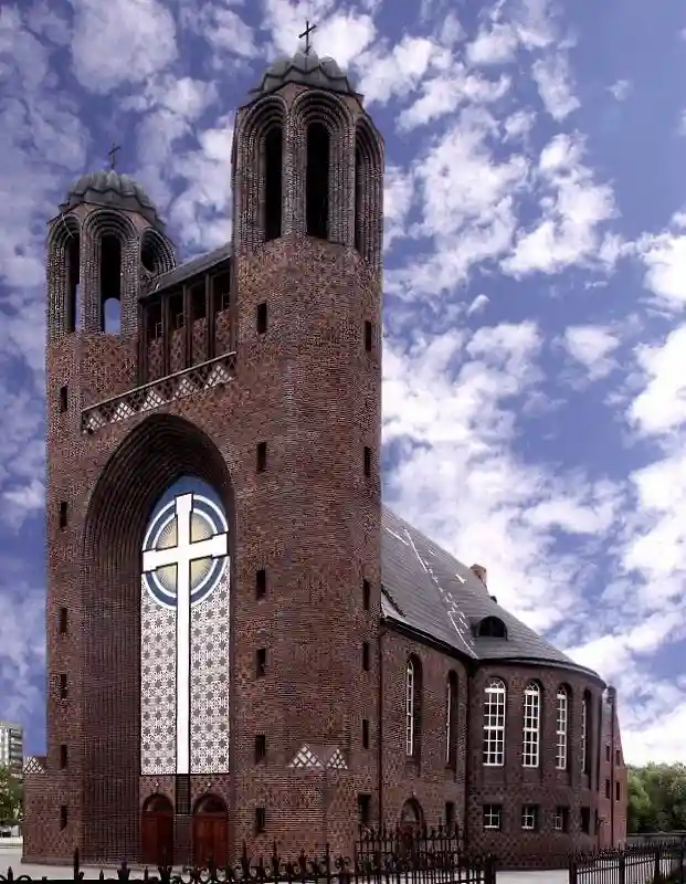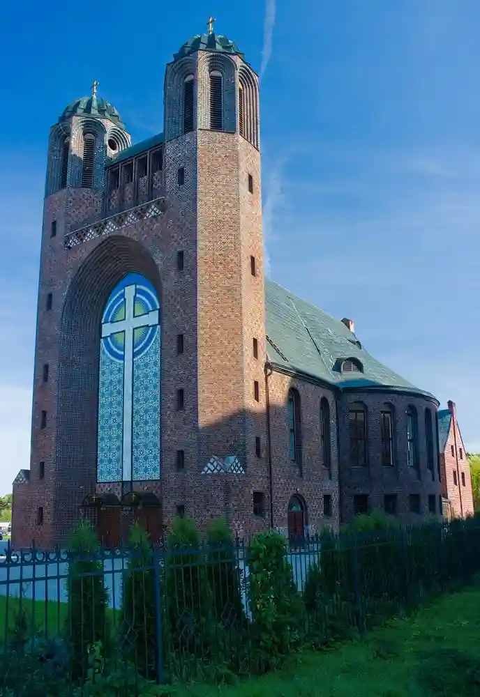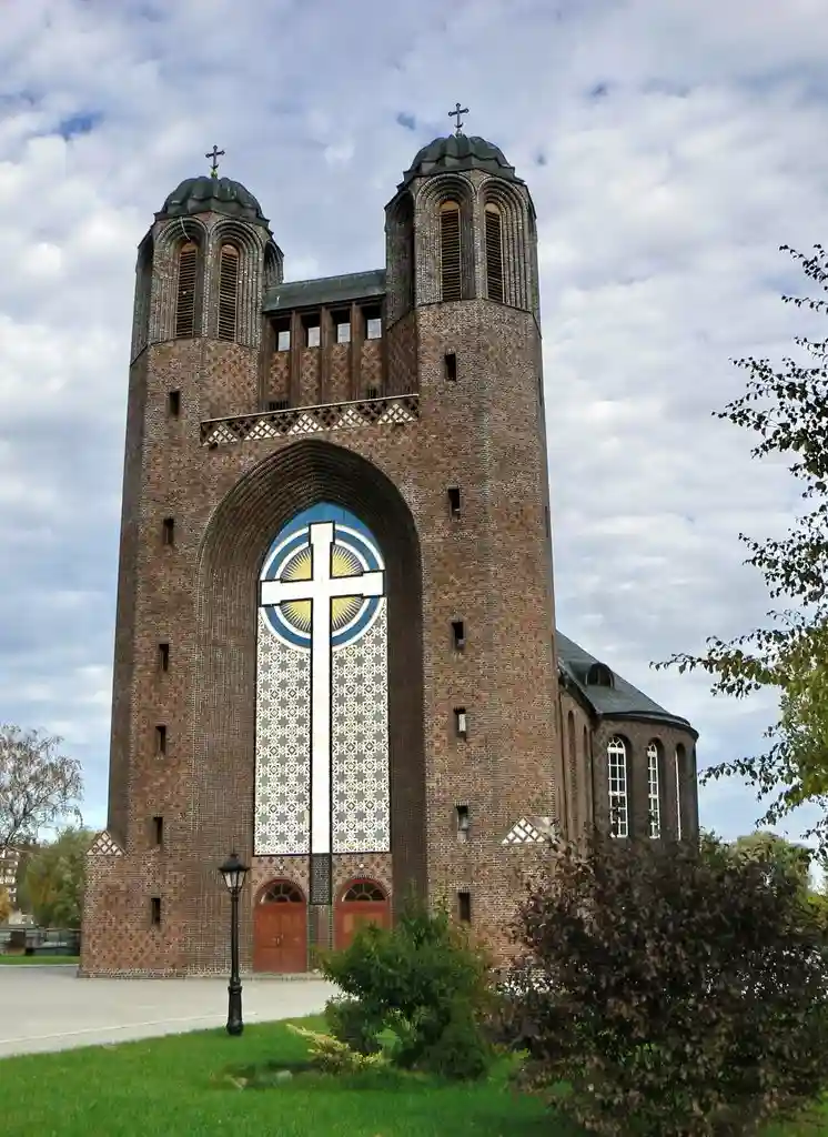 Основная архитектурная деталь западного фасада — огромная ниша-портал, поверхность которой украшена панно кадинской майолики с большим крестом. На пересечении перекладин креста была написана фраза «Слово о кресте являет могущество Господа». С восточной стороны к церковному зданию примыкал дом священнослужителя. Для облицовки здания был использован кадинский клинкер — декоративный кирпич.