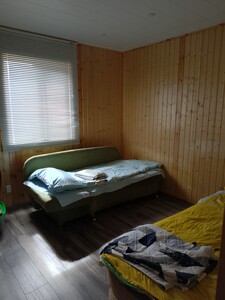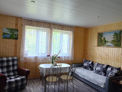 В доме две спальни, кухня-гостиная, санузел, прихожая, веранда. Есть всё необходимое для комфортного проживания: ТВ, Wi-Fi, холодильник, микроволновка, электроплита, стиральная машина, гор. и хол. вода, санузел, душ, посуда, мангал, постельное бельё, полотенца.