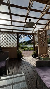 + Отличный домик с беседкой и террасой, закрытая большая территория очень красиво цветы лес рядом. В домике есть все необходимое для проживания, внутри есть сауна и за доп. Плату можно ей воспользоваться (рекомендую отличный релакс). Хорошее расположение все рядом магазины, Сортавала, парки совсем недалёко. Рекомендую для тех кто хочет проживать именно в отдельном домике. Приветливый хозяин большое ему спасибо за своевременное заселение и вообще за всё. Нам понравилось данное жилье.- Единственное пожелание чтобы поменяли кровать т. к. Она уже очень плоха, что пружины совсем впиваются в спину))) спасть конечно на ней очень некомфортно.