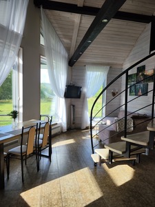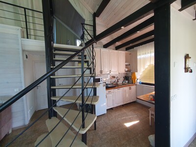 Первый этаж: кухня-столовая, спальня с двуспальной кроватью, туалет, ванная, гостинная.
