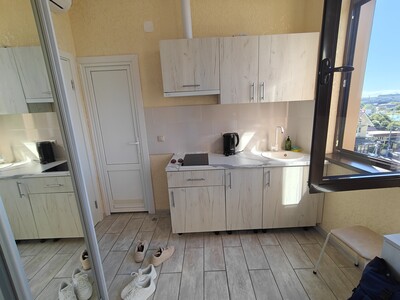 - Расположение удобное, если на машине или транспорте. Хотели пешком дойти до моря, неудобно. Идти по шоссе Пятый этаж нам достался, лифта нет)