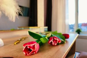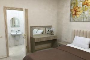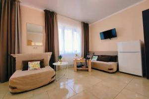 Номер оборудован: Двуспальная кровать, диван-кровать, кресло-кровать, прикроватные тумбочки, зеркало, комод,мини-холодильник, телевизор, кондиционер. Ванная комната: душ, зеркало, раковина, полотенцесушитель и туалет.