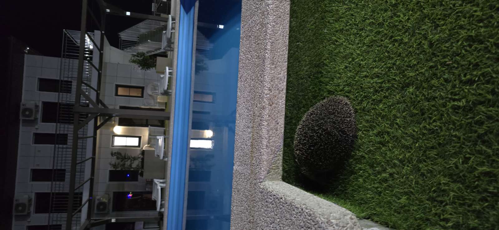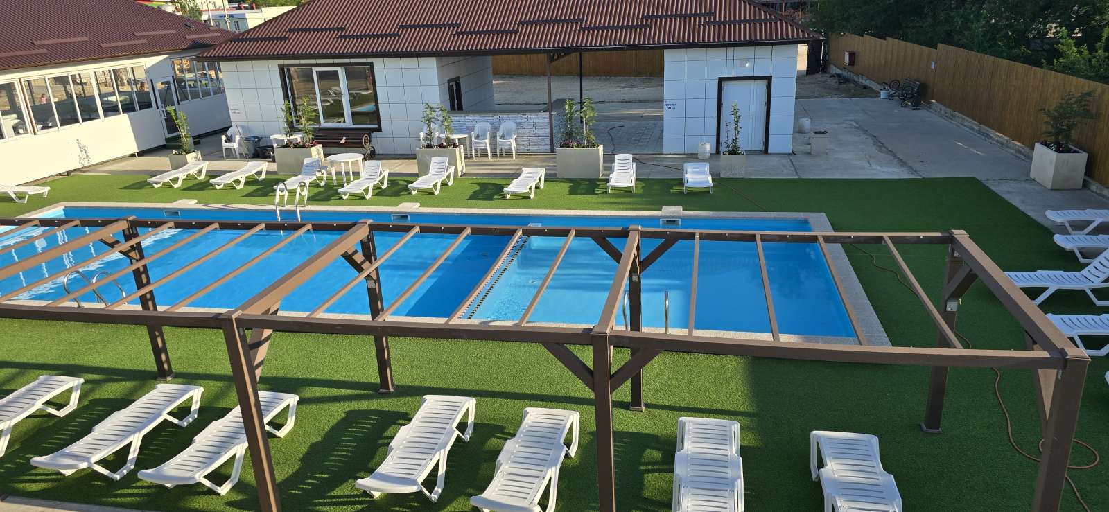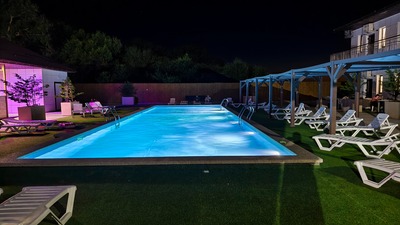 - На территории огромный открытый бассейн, благоустроенная зона для отдыха с шезлонгами, летними зонтиками и столиками