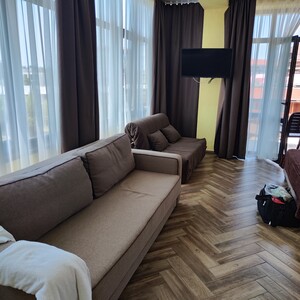 Пляж: общественный галечный в 400 м от отеля (третья береговая линия). Зонты и лежаки платно.