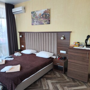В Отеле «Омега плюс» Вы можете забронировать номера: Двухместный номер с 1 кроватью стандарт с балконом, Двухместный номер с 1 кроватью Стандарт+ с балконом, Семейный номер 2-х комнатный, Двухместный номер с 1 кроватью Стандарт, Двухместный номер с 1 кроватью стандарт в цокольном этаже. Свободные номера можно проверить, задав даты поездки.