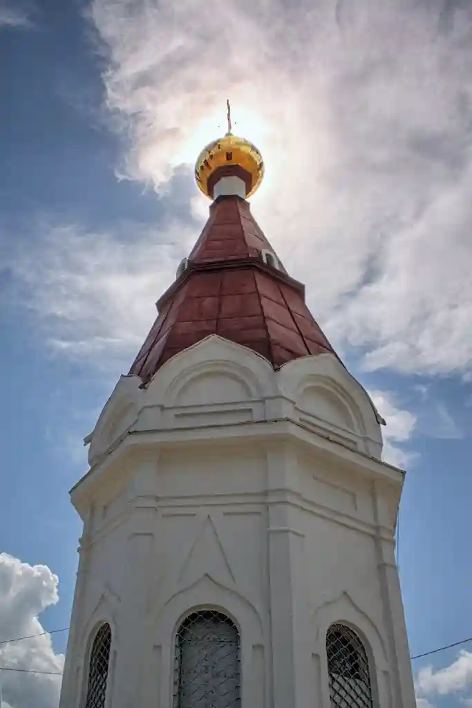 Восьмигранный объём прорезан тремя дверными и четырьмя оконными проёмами с полуциркульным завершением, на восточной грани окно ложное. Рёбра восьмерика подчеркнуты пилястрами, переход к высокому шатру оформлен кокошниками. Грани шатра перебиты карнизом и слуховыми окнами с четырёх сторон. В каждой грани стены под окнами, над карнизом и под ним – лежачие филёнки. Обрамление окон завершено килевидными наличниками, повторяющими очертание кокошников. Декор обобщённый, крупных членений, рассчитан на восприятие с дальних расстояний, стилизован под древнерусские формы. Металлический шатёр увенчан небольшой луковичной позолоченной главкой. Над главкой – православный крест.