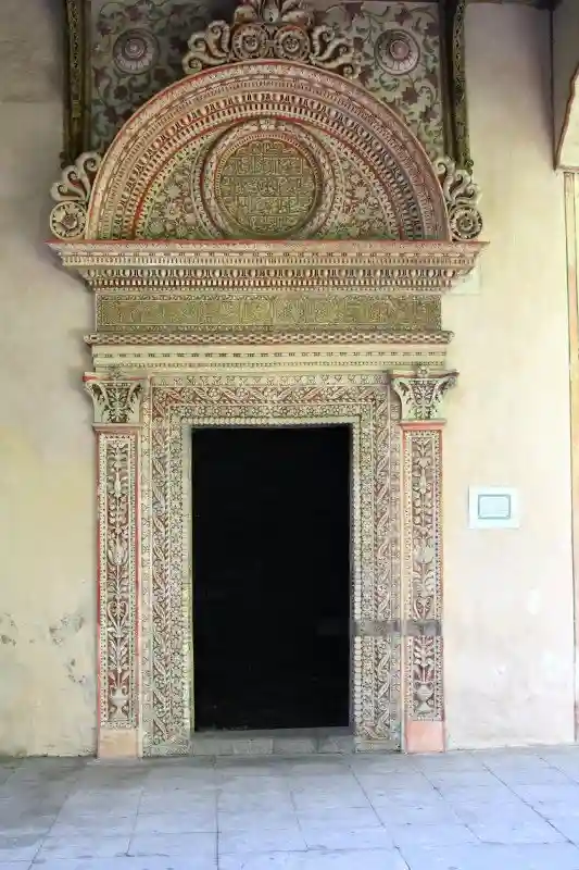 Портал выполнен из резных блоков известняка в стиле ломбардо-венецианского Ренессанса. На нём изображены дубовые листья, цветы, желуди, монеты, нити жемчуга. Над дверью находится арка, украшенная растительными завитками и цветами. Также портал украшен двумя надписями на арабском языке, которые высечены из камня и позолочены.