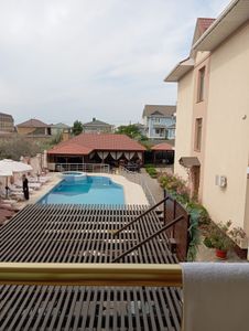 Шедевральный бассейн. Оббит чем-то вроде линолеума, поцарапаться об швы плитки, как это бывает в бюджетных бассейнах невозможно. Глубина около 1.5 метров везде. Хорошие лежаки и зонты от солнца.