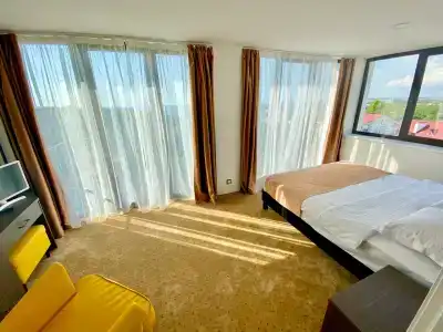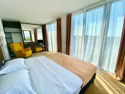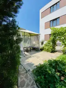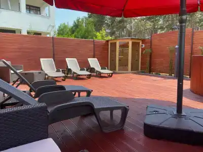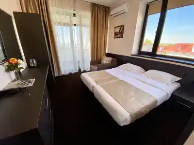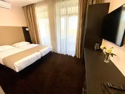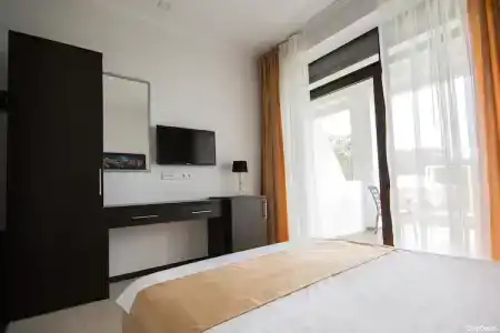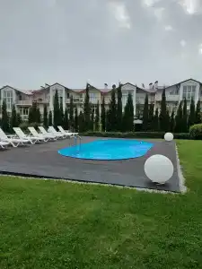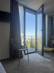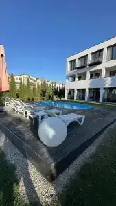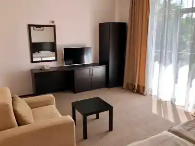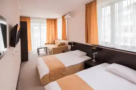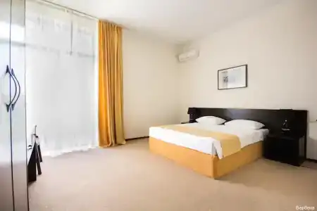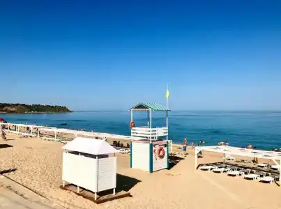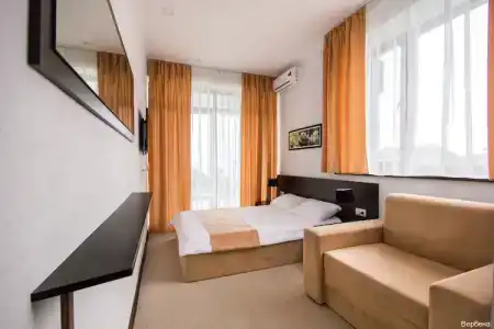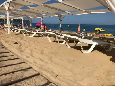 Пляж: общественный песчано-галечный пляж в 400 м от отеля, третья береговая линия.