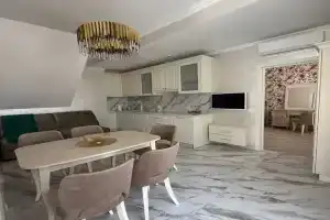 Новые апартаменты на первой линии в Севастополе (п. Любимовка). В апартаментах новый дизайнерский... ремонт, площадь 65 кв. М. Расположены на втором этаже. Имеется кондиционер. Два телевизора, wi-fi. В номере располагается большая кухня-гостиная и спальня с кроватью king-size, трюмо, шкаф. В ванной комнате имеются полотенца, электросушилка. В большой кухне-гостиной диван, обеденная группа, полноценная кухня укомплектована посудой, столовыми приборами, холодильником, микроволновой печью, стиральной машиной, варочной поверхностью. Также есть гладильные принадлежности и сушилка.