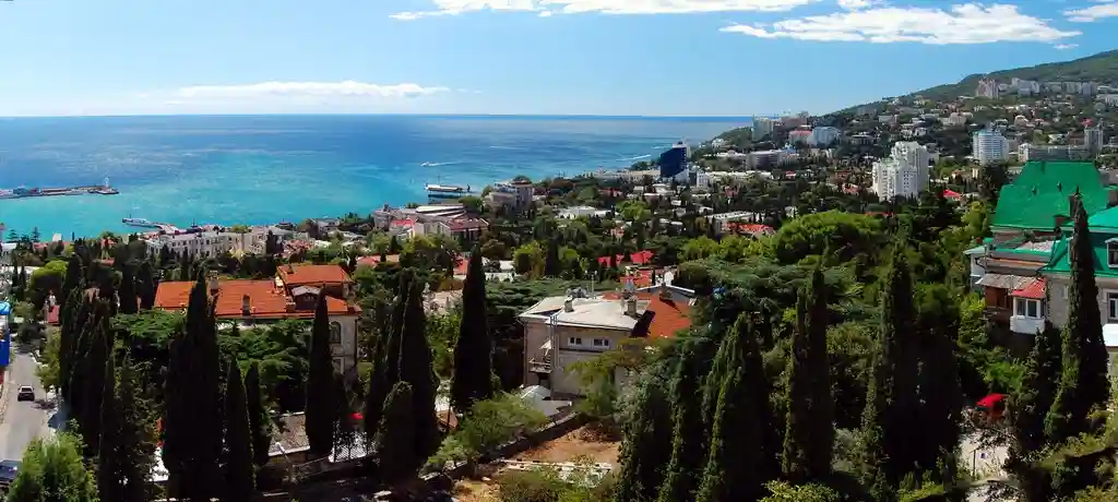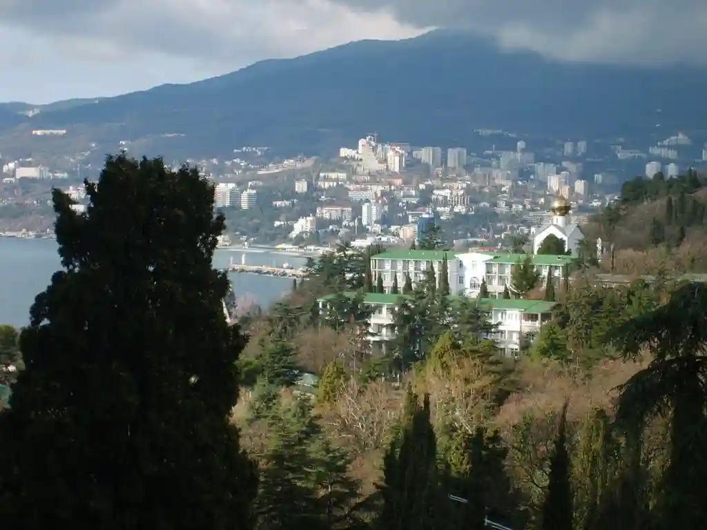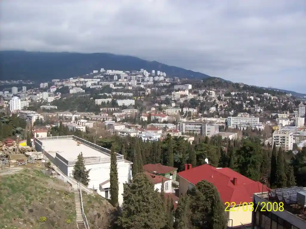 С высоты Дарсана видно, что побережье Ялты обращено в сторону открытого моря и как сбегают по его крутым склонам домики, внизу выстраивающиеся вдоль линий улиц; хорошо просматриваются новые кварталы высотных домов, окружающих центральную часть города.