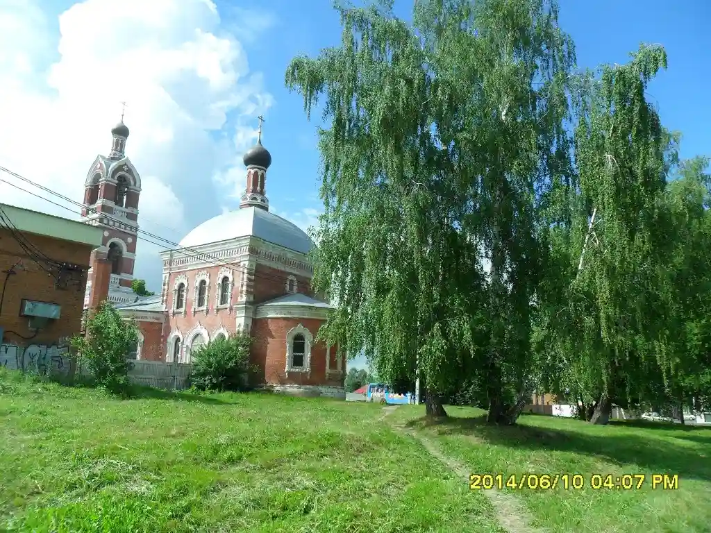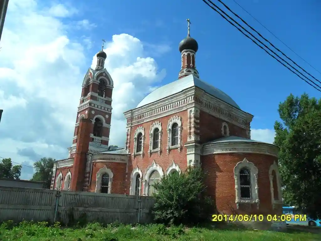 Одноглавая кирпичная церковь в псевдорусском стиле с трапезной и высокой колокольней.