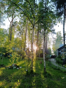 уютный дом 60м кВ м в сосновом бору на участке 5 соток, с гортензиями, окна в пол с видом на сад, большая летняя беседка с гамаком и качелями.