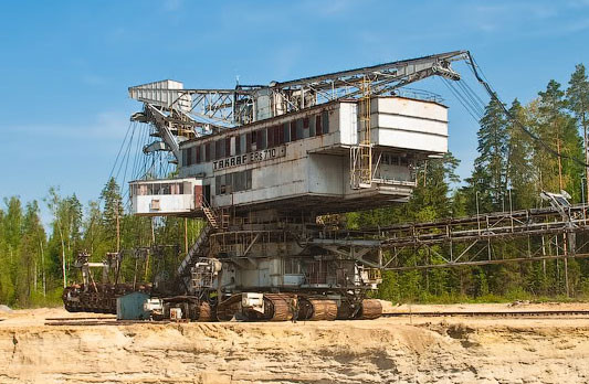 Каждый карьер рудника представлял собой длинный (до 5 км) ступенчатый желоб, по одной из ступенек которого, из одного конца карьера в другой, были проложены параллельные друг другу железнодорожные пути. По двум из них перемещался упомянутый выше экскаватор, или сразу несколько. По третьему — грузовой состав, наполнявшийся рудой. Технология ландшафтостроения такова — медленно двигающийся экскаватор срезает своей многоковшовой лентой так называемые вскрышные породы и по длинной (30-70 метров) стреле сбрасывает их в отвал. По выработке рудоносного горизонта рельсы вместе с экскаватором параллельно переносят в обратную от отвалов сторону, и все начинается сначала. В результате образуется множество длинных (до 5 км) параллельных песчаных гряд, высота которых может достигать 50 метров. Самые удаленные от карьера гряды заравнивали специальными агрегатами, получавшиеся при этом песчаные поля засевали стройными рядами сосен.