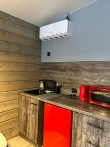 - Тёплый пол, санузел, кухонная зона с микроволновкой, холодильником и чайником.