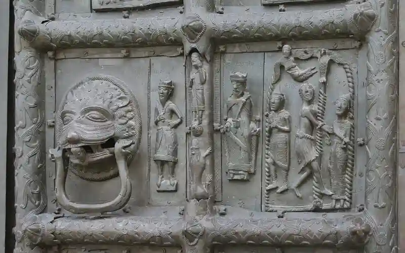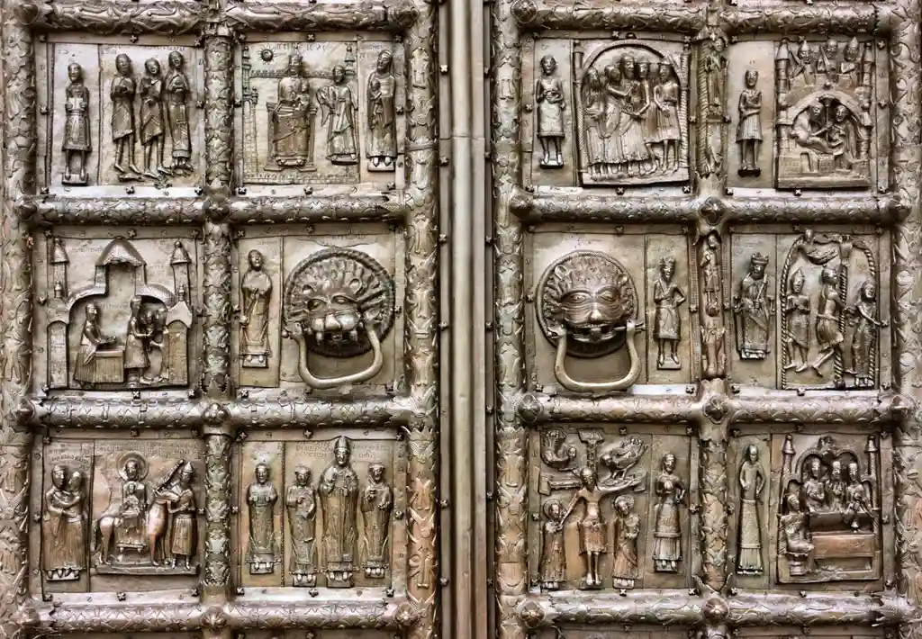 На западном портале смонтированы бронзовые Магдебургские врата в романском стиле с большим количеством горельефов и скульптур.
