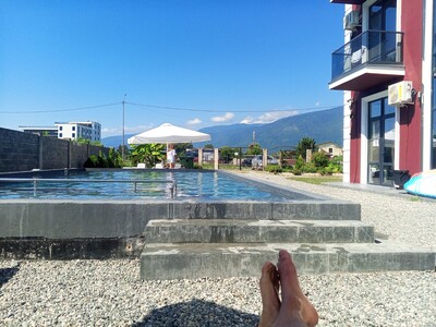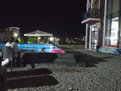 + Для Абхазии - это очень хороший отель! Рядом есть неплохие столовые, пару отличных мест, где можно купить вкуснейший шашлык и пиццу и хачапури! Море очень близко, берег приятный. Хороший бассеин, достаточный для периодических заплывов. Заселили вовремя, в номере убирали, полотенца меняли!- В номерах над кроватями и около бассеина есть торчащие провода, видимо не доделана подсветка. И матрасы уж очень неудобные)