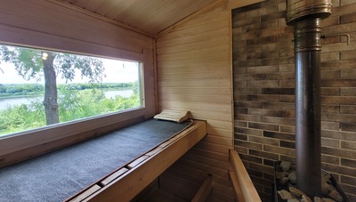 Русская баня на дровах с панорамным окном в парилке. В комнате отдыха печь-камин и уютный диван. Время парения не ограничено. Растапливается самостоятельно, при желании можем растопить к вашему приезду.