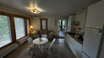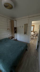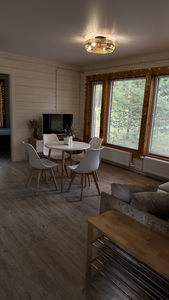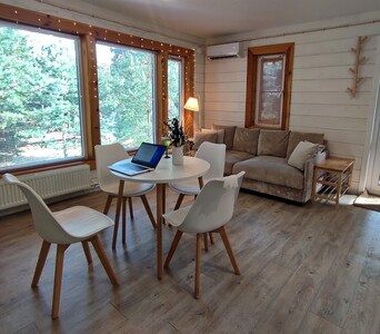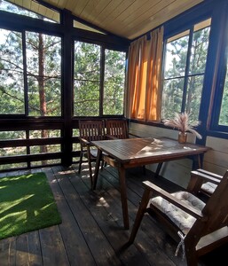 Теплый уютный дом на лесной опушке в д. Кельцы, что в 35км от круиза по Солотчинскому шоссе. В доме 2 изолированные спальни с двух спальными кроватями, матрасы и подушки мемори фом, сатиновое бельё, кухня -гостиная с большим удобным диваном. Кухня оборудована всем необходимым: варочная плита, холодильник, микроволновая печь, посуда на шесть персон, сковорода, маленькая и большая кастрюля. Сан узел и ванная комната отдельные, есть полотенца, жидкое мыло, туалетная бумага. Перед домом беседка со столом, шестью стульями, мангалом, казаном, решеткой для гриля, шампурами. В дождливую или ветреную погоду приятно проводить время на застеклённой террасе с панорамными окнами, открывающие потрясающий вид на заповедный лес. А на жаркую погоду в доме установлен кондиционер.