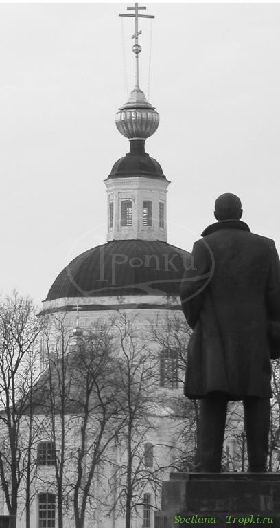 На этом месте и построили деревянную шатровую церковь, предшествующую нынешнему Богородицкому храму. Место это всегда было важным для горожан. Не случайно в советские годы напротив церкви построили главные атрибуты новой жизни - Дворец культуры и памятник Ленину. Так и стоит он до сих пор: