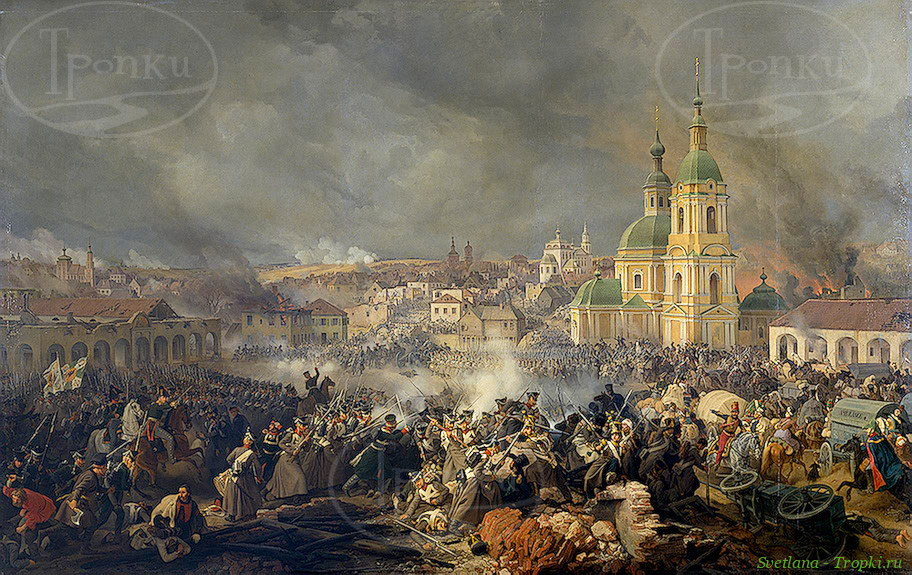 Известное полотно Петера фон Гесса. "Битва под Вязьмой" открывает панораму Торговой площади и Богородицкой церкви во время сражения: