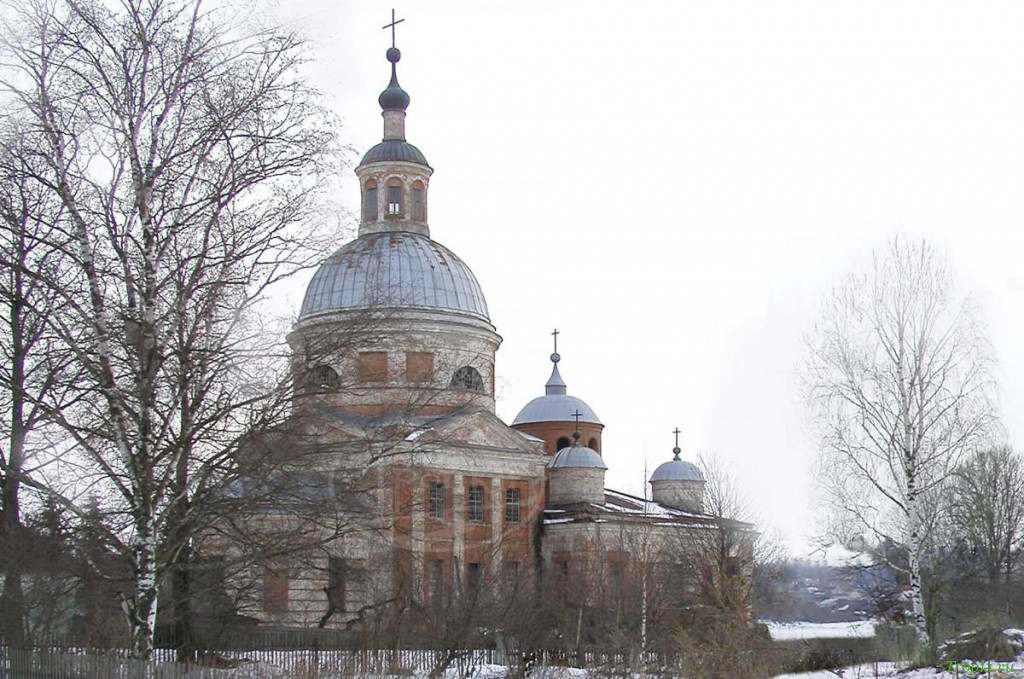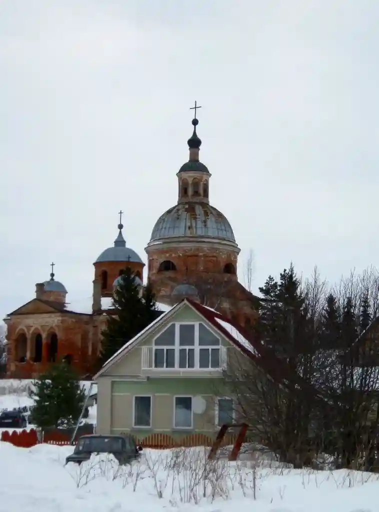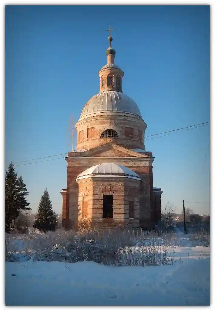 На западной стене была вделана доска со следующей надписью: "На месте покоящейся бабки Акулины Ивановны и матери Софии Савичны Барышниковых построен храм сей во славу Божию из уважения праху родительницы в лето от Р.Х. 1806-е". Стоявшая на месте каменного храма дубовая церковь была тогда же продана в село Собакино-Кобылино Сычёвского уезда.