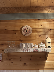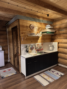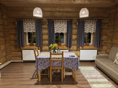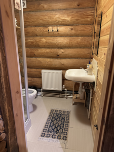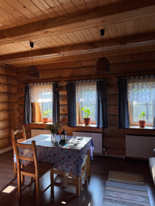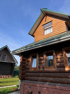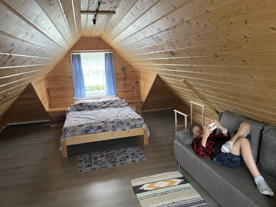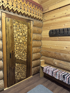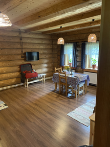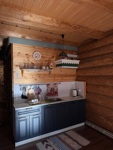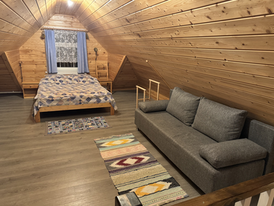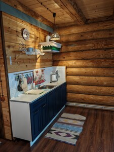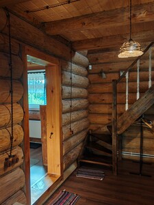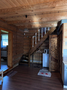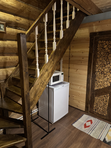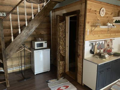Деревянный сруб на семью или не большую компанию, на первом этаже прихожая, кухня-гостиная и сан.узел, на втором этаже спальня.