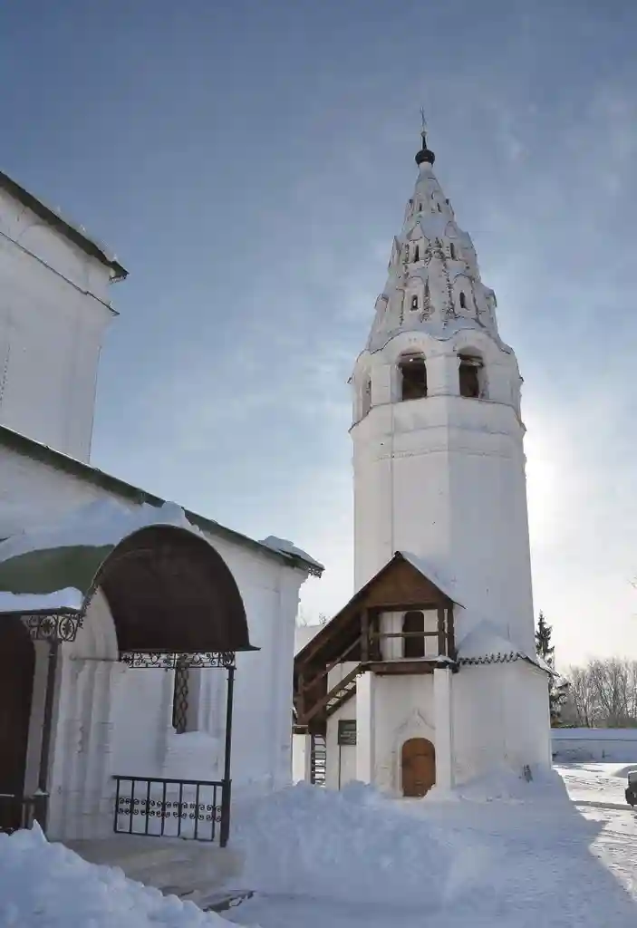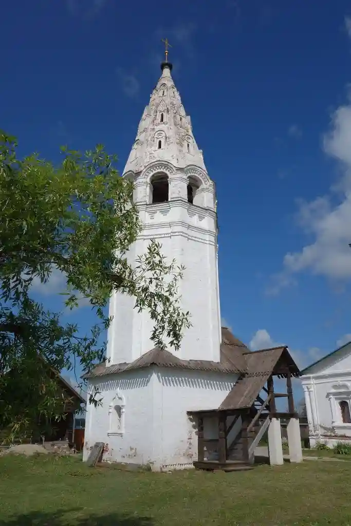 Восьмигранный столп шатровой колокольни поставлен на невысокий четверик, к которому пристроена деревянная лестница. Её стены практически лишены декора, что делает её уникальной среди суздальских шатровых колоколен. Скромным украшением верхней части служит резное обрамление арочных проёмов и наличники над окнами-слухами.