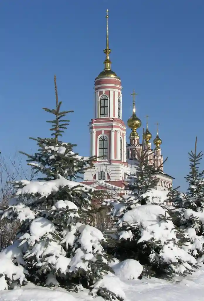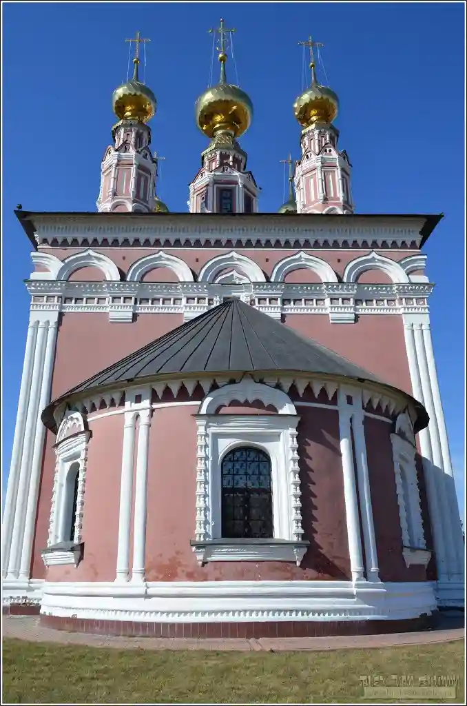 Церковь богато украшена - окна белыми наличниками с ребристыми колонками, под кровлей интересный карниз, чуть ниже - поясок. Световые барабаны - белыми узорами.