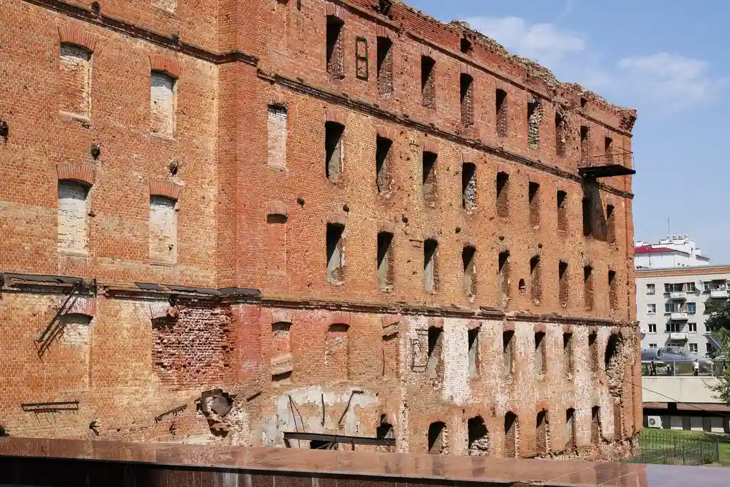 Мельница Гергардта (Грудинина) —типовое дореволюционное пятиэтажное здание мельницы, ставшее символом жестокости уличных боев в Сталинградской битве. Крыша здания уничтожена прямым попаданием авиабомб, видны следы многочисленных фронтальных попаданий артиллерийских снарядов. Буквально каждый квадратный метр наружных стен здания иссечен пулями и осколками. Сильно повреждена также и стоящая рядом труба.