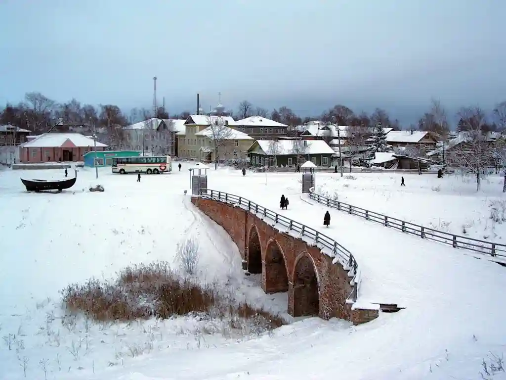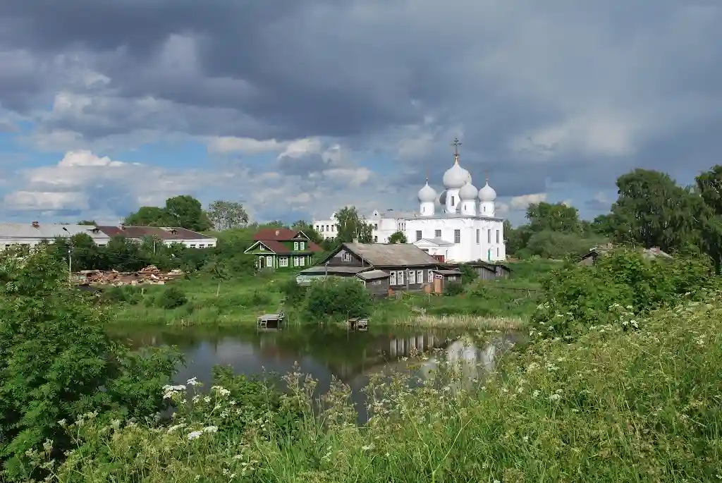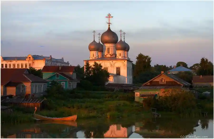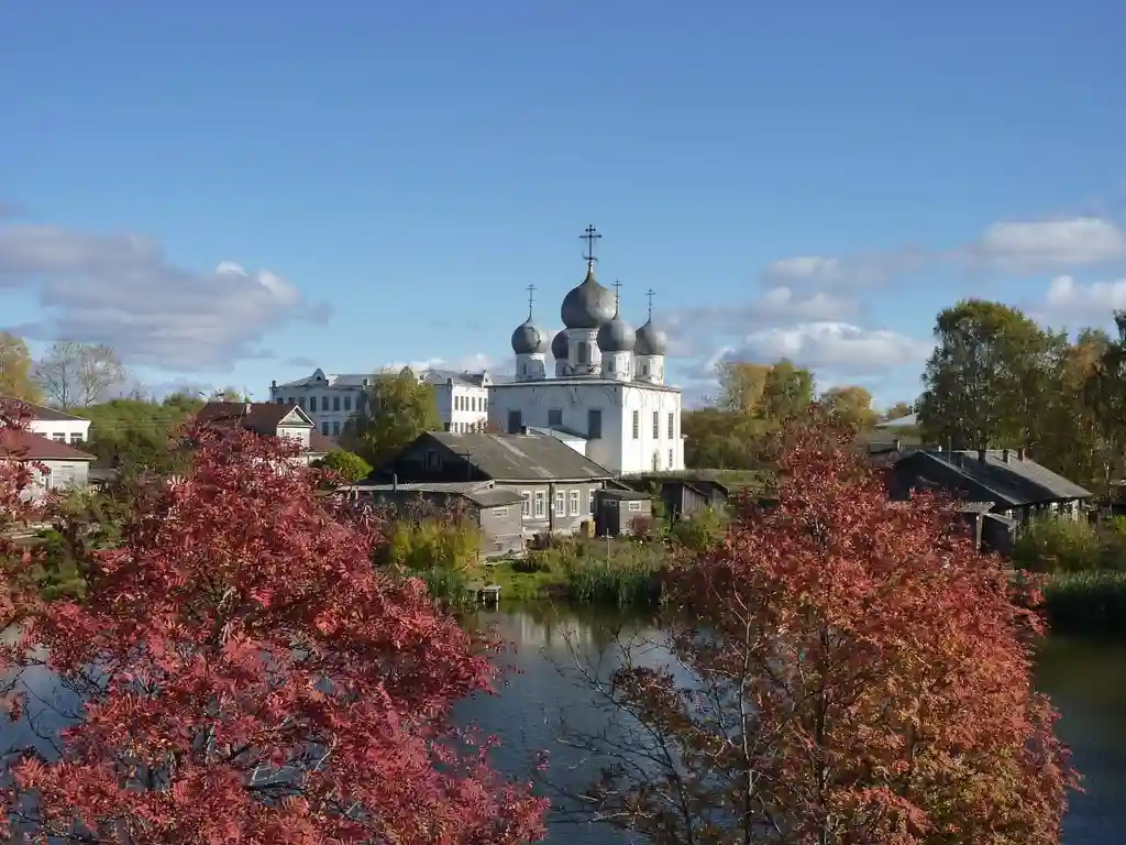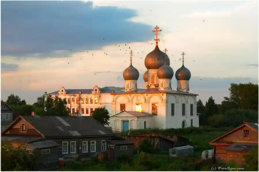 - Недалеко от берега Белого озера нарядная, украшенная широким изразцовым фризом, с двумя рядами декоративных кокошников, пятиглавая церковь Всемилостливого Спаса (1723 год) с трапезной и шатровой колокольней в традициях XVII века.
