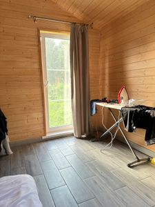 - Комфортабельная гостиная с кухней, 1 двуспальный ортопедический матрас на втором этаже и большой раскладной двуспальный диван в гостиной, детская кроватка для грудничков, с/у с душевой кабиной, сауна. В доме есть вся необходимая посуда для комфортного проживания, решетка-гриль, шампура, пастельные принадлежности, полотенца и средства гигиены, чай, кофе.