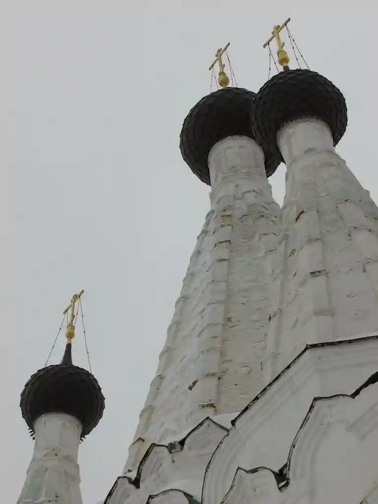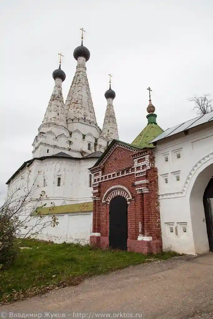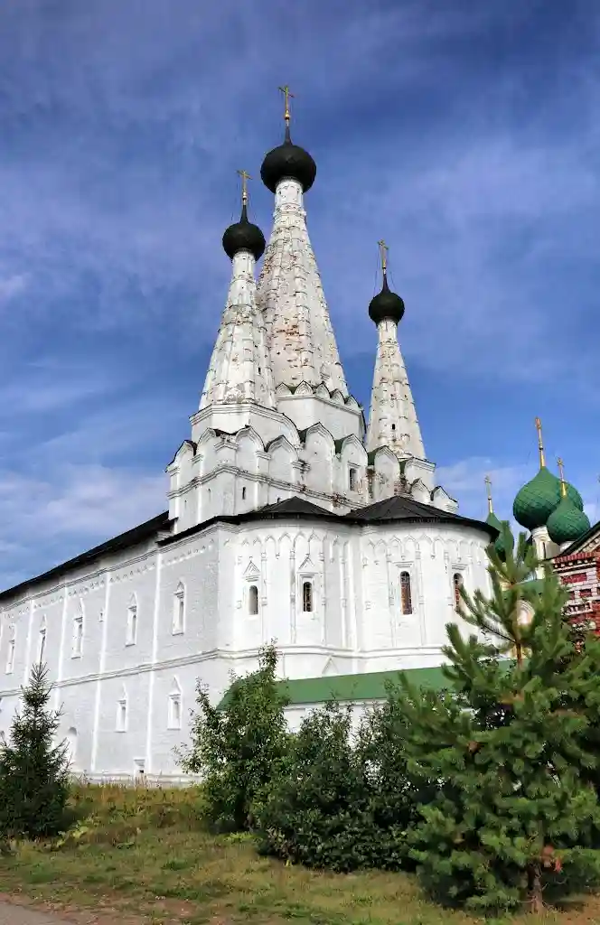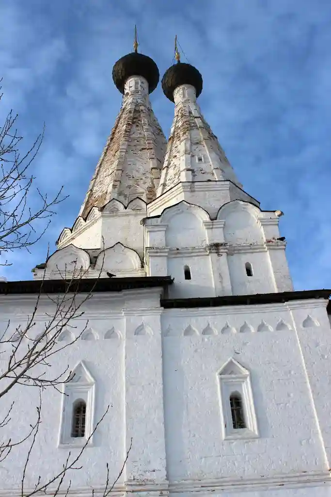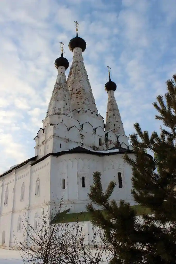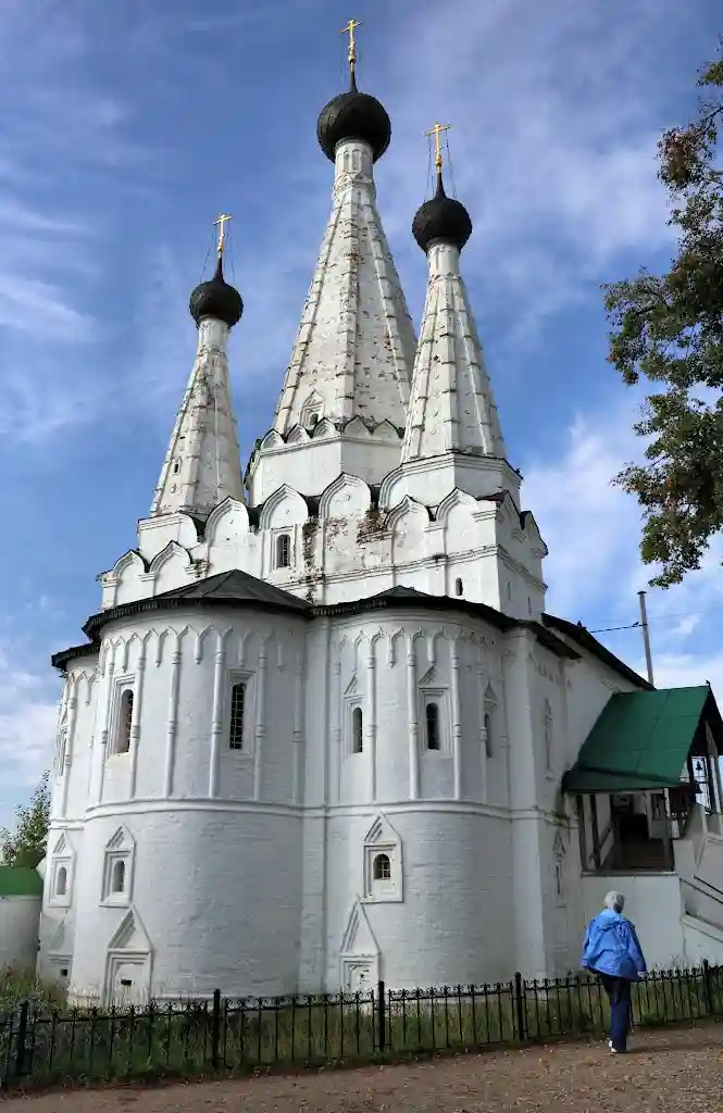 Три стройных шатра храма, расположенного на возвышенности, уже издали приковывают внимание благородством пропорций, изяществом, легкостью. Успенская церковь принадлежит к ряду замечательных созданий каменного шатрового зодчества - одной из наиболее ярких страниц древнерусской архитектуры. "Троеверхний" храм Алексеевского монастыря - это новый шаг в развитии шатрового зодчества, получившего широкое распространение в XVI и первой половины XVII столетия.