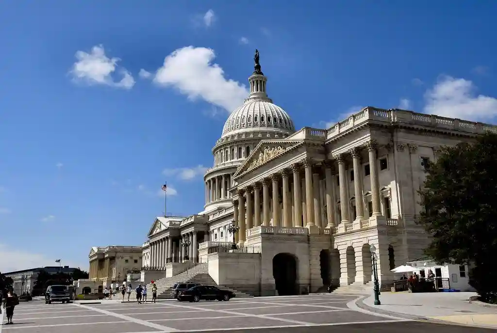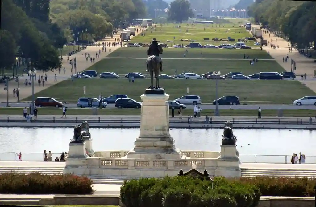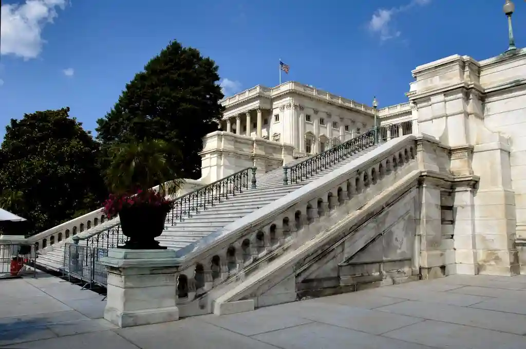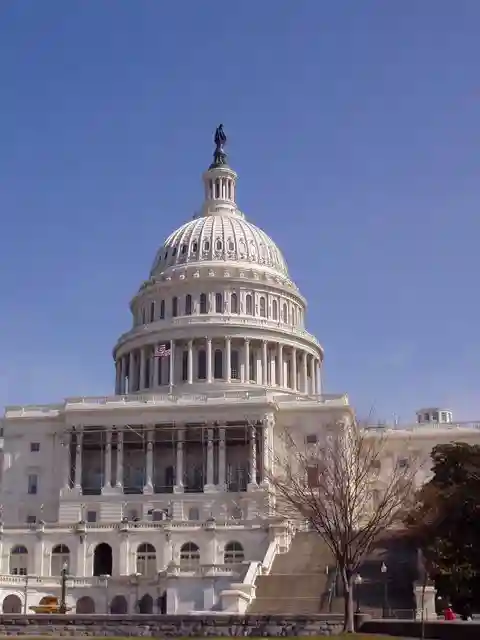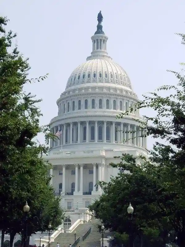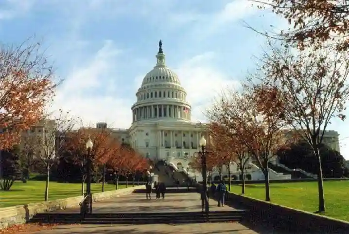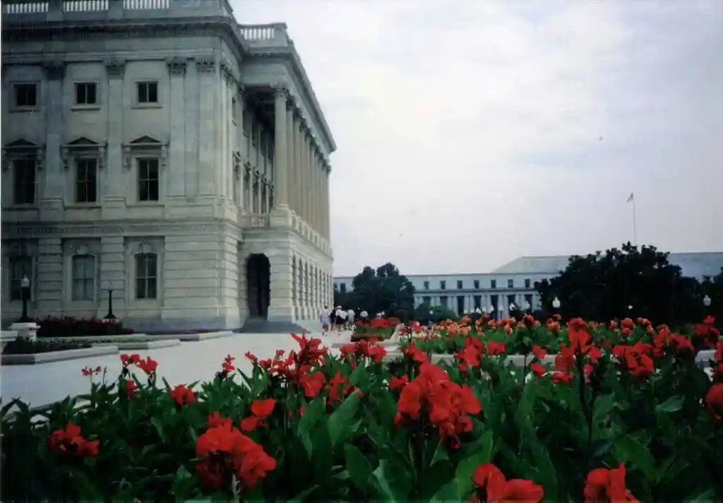 Первый камень в основание Капитолия был заложен Джорджем Вашингтоном 18 сентября 1793 г. Строительство пышного здания в стиле ампир велось несколькими поколениями архитекторов. Уже в ноябре 1800 г. в недостроенном Капитолии впервые собрался Конгресс, однако в 1814 г. его сожгли англичане и восстановительные работы заняли пять лет. В 1820-27 гг. южное и северное крыло здания были наконец соединены переходом, над которым вознёсся купол.