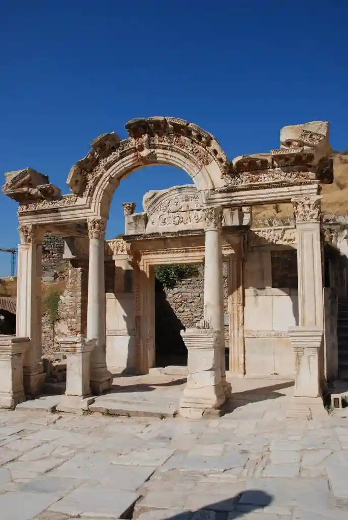 Надпись, выгравированная на архитраве храма, свидетельствует о дате его сооружения — около 138 года н. э. — малоизвестным архитектором П. Квинтилиусом, который посвятил храм императору Адриану. Перед монументальным пронаосом поднимаются пьедесталы от четырёх статуй, которые когда-то украшали храм. По тем надписям, которые сохранились на пьедесталах, можно определить, что это были статуи императоров Диоклетиана, Максимиана, Констанция Хлора и Галерея. Коринфский ордер храма безошибочно определяется с первого взгляда по изысканности скульптурной орнаментики. Две центральные колонны поддерживают лёгкую, утончённую арку — всё, что сохранилось от оригинального треугольного тимпана, который когда-то венчал здание. Орнаментика арки как бы продолжает мотив фризов, которые идут цельной линией по антаблементу; в центре арки помещён бюст Тихе (богини-покровительницы города). Архитравы порталов богато декорированы с использованием античных орнаментов. Над главным порталом, который ведёт в наос, находится полукруглая люнетта, где на фоне утончённого переплетения цветов и листьев аканта представлена женская фигура, которая напоминает античные изображения Медузы. В середине наоса можно увидеть часть оригинального подиума, который когда-то поддерживал статую императора Адриана. Храм был изображён на реверсе турецкой банкноты в 20 миллионов лир 2001—2005 годов и на новой 20-лировой банкноте 2005—2009 годов.