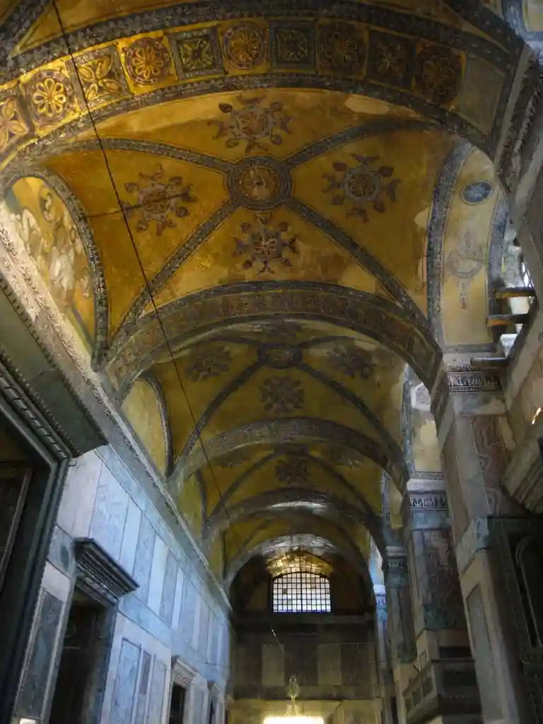 Подкупольное пространство с северной и южной сторон сообщается с боковыми нефами с помощью арок, поддерживаемых порфировыми и малахитовыми колоннами, вывезенными их храмов Малой Азии и Египта; под этими арками идёт ещё по ярусу подобных же арок, которыми открываются в подкупольное пространство устроенные в боковых нефах галереи гинекея, а ещё выше — громадные арки, поддерживающие купол, заделаны прямой стеной с окнами, расположенными в три ряда. Кроме этих окон, внутренности храма дают обильное, хотя и несколько рассеянное освещение 40 окон, опоясывающих основание купола, и по пяти окон в больших и малых нишах.