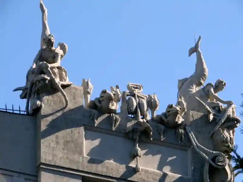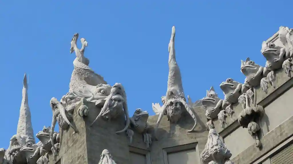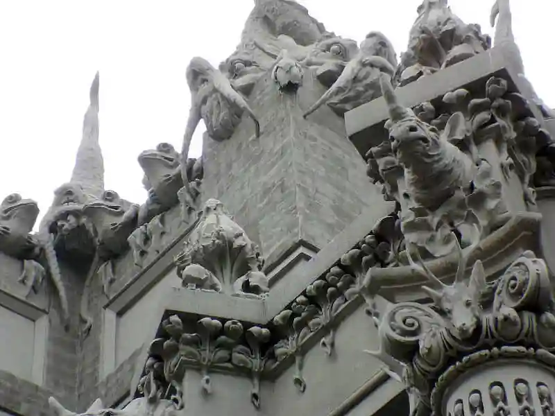 На стенах дома находятся бетонные головы носорогов, жирафов, львов, крокодилов, антилоп и прочих африканских зверей. Бетонные хоботы слонов, свисающие над тротуарами, использовались в качестве водосточных труб. На крыше расположились гигантские жабы, морские чудовища и нереиды с цепями вместо волос. На крыше используется высокий парапет, что позволяет практически полностью скрыть кровлю.